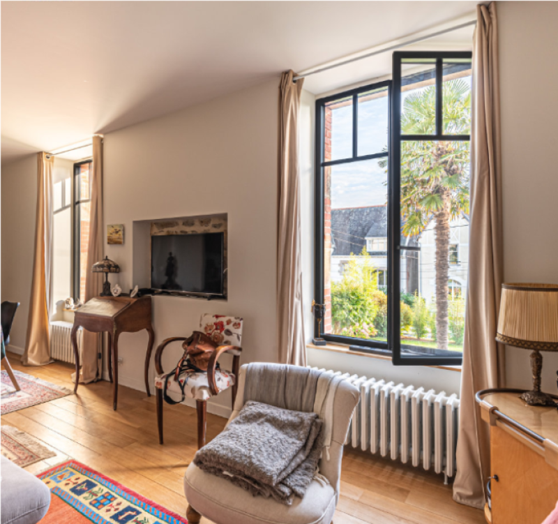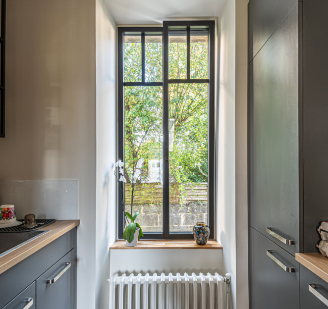 Pour ce projet à Nice, L'Ouverture Française a installé une porte-fenêtre oscillo-battante en aluminium et acier de dimensions 2,15 m de hauteur sur 1,10 m de largeur, avec un châssis aux lignes fines.